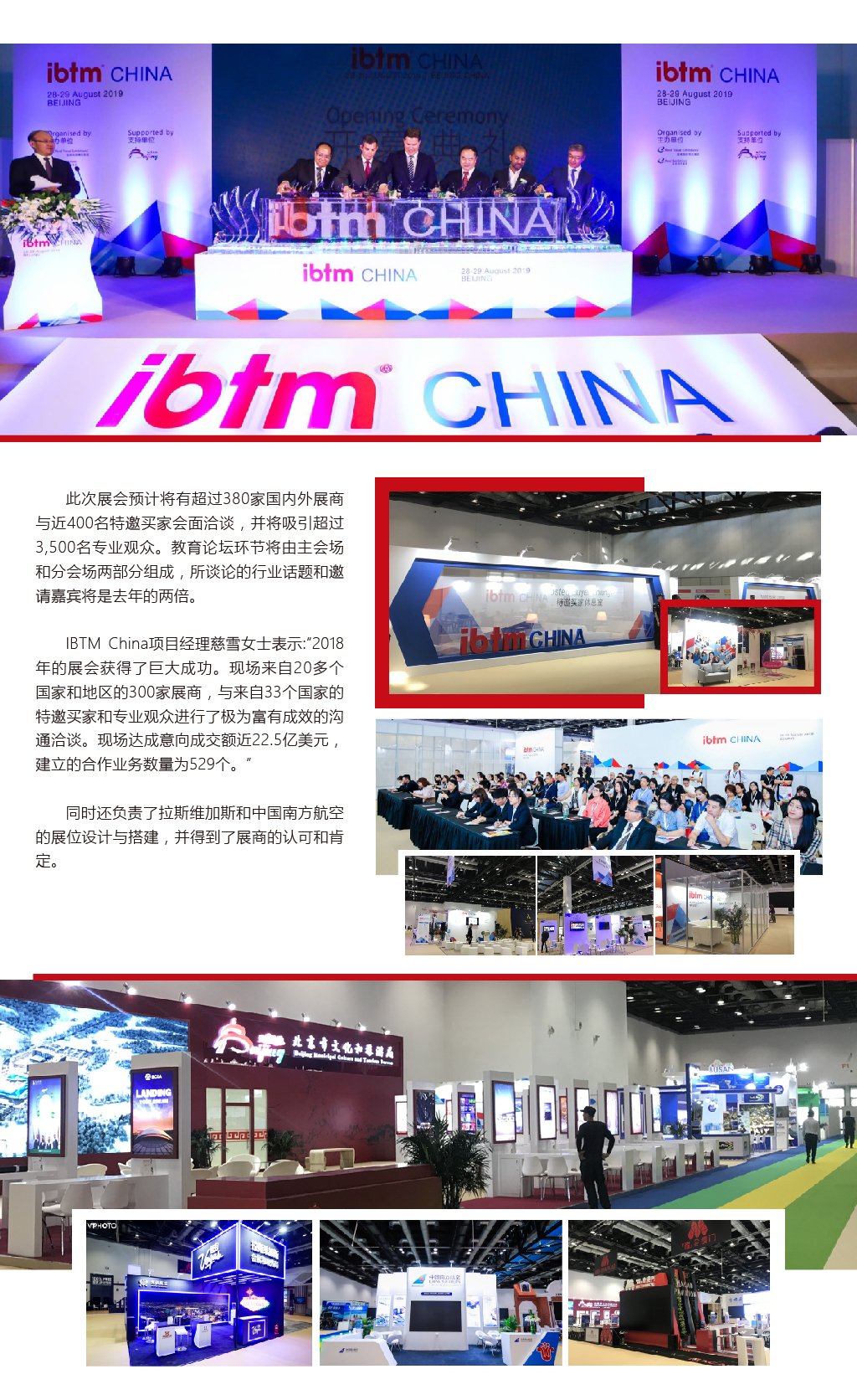 IBTM China作為勵(lì)展旅游展覽集團(tuán)旗下ibtm®系列展覽的中國站 -- 首次披露其2019年展會(huì)具體信息。主辦方明年將增大國內(nèi)二三線城市和亞太區(qū)域內(nèi)特邀買家的邀請比例。引進(jìn)“Happy Hour”環(huán)節(jié)并增設(shè)“互動(dòng)體驗(yàn)區(qū)”,增強(qiáng)展商和特邀買家的現(xiàn)場多維互動(dòng),力圖通過創(chuàng)造一系列全新社交活動(dòng)以促進(jìn)展商和買家建立有效的商務(wù)合作。盛典公司為本次展會(huì)提供了主場運(yùn)營及主場搭建服務(wù),同時(shí)負(fù)責(zé)拉斯維加斯會(huì)展和觀光局、海南航空展臺(tái)的搭建,獲得了展商及主辦方的認(rèn)可。